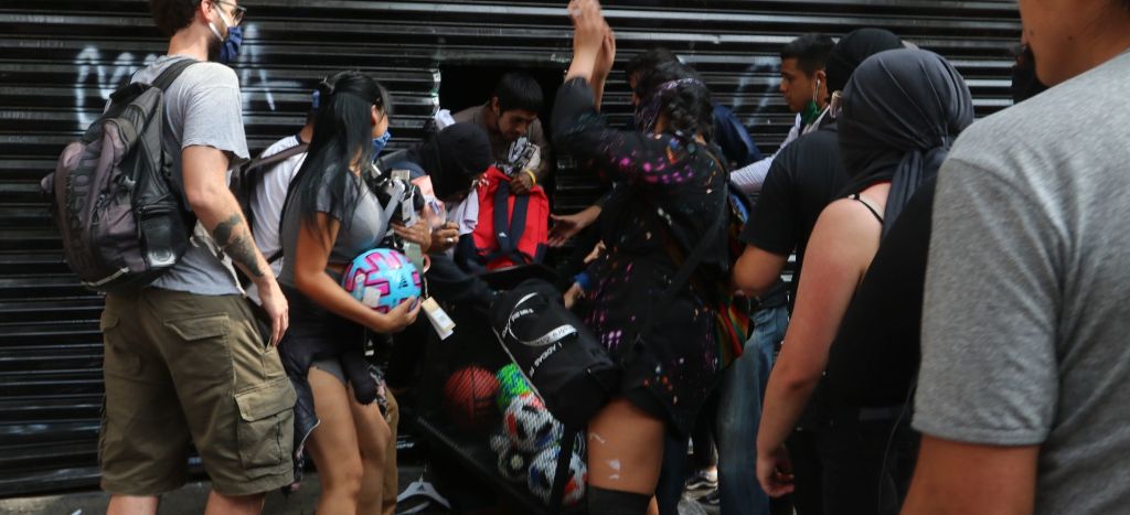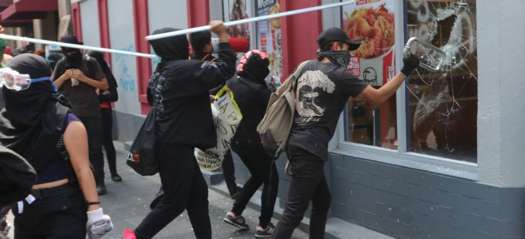 Personas encapuchadas realizaron pintas y destrozos sobre el Paseo de la Reforma y en el Centro Histórico de la Ciudad de México, así como saqueos en comercios y en tiendas de autoservicio.