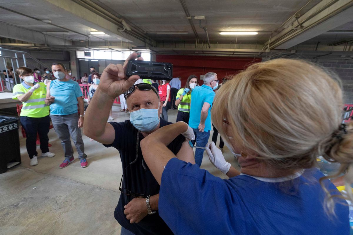 Un hombre se fotografía mientras recibe la vacuna contra la covid, el 21 de mayo en Murcia.