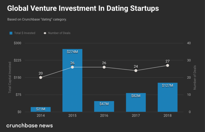 En 2018, por ejemplo, los inversores de riesgo colocaron $ 127 millones a nivel mundial en 27 nuevas empresas clasificadas por Crunchbase como centradas en citas. Si bien eso no es un cambio total, es ciertamente pequeño en comparación con los más de $ 300 mil millones en inversión de riesgo global en todos los sectores el año pasado.