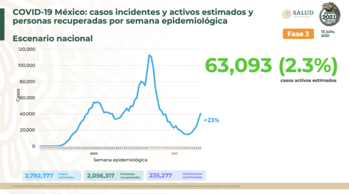 Sobre la pandemia, ayer el subsecretario Hugo López-Gatell explicó que “está claro que la primera ola empezó cuando empezó la epidemia en febrero de 2020, la segunda ola epidémica empezó en octubre de 2020 y llegó a un punto máximo en enero de 2021, después se redujo durante seis meses consecutivos, y la tercera ola epidémica tiene cuatro semanas desde que empezó el incremento acelerado de casos”.