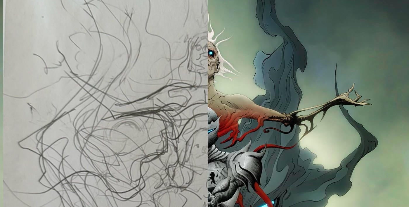 “Toda la imagen debería ser como una estatua griega”, dijo Lee a ComicBook.com en un comunicado. “Un niño heroico con armadura… El caballero incorpóreo flotando detrás de él crucificado… La gran cabeza de demonio con cuernos formados por la materia negra arremolinada… La cabeza del niño enmarcada por las entrañas del fantasma. Como un halo o corona formado por las tripas.”