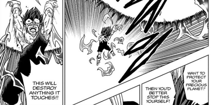 En el capítulo 75, Vegeta da otro paso drástico hacia el reino de la villanía en el momento en que se da cuenta de que su reciente transformación llamada Ultra Ego podría no ser suficiente para derrotar a Granolah. Aunque el Príncipe Saiyajin gana más poder cuanto más daño sufre y cuanto más aumenta su ansia de batalla, Vegeta se da cuenta de que su visión comienza a nublarse como resultado de sus heridas culminantes y se da cuenta de que necesita terminar la batalla lo más rápido posible. Así que invoca una enorme bola de energía, probablemente la técnica de destrucción de Beerus, que revela que destruye todo lo que toca y que si Granolah quiere proteger su precioso planeta, será mejor que lo detenga él mismo. Por supuesto, Granolah logra destruir el aterrador ataque, protegiendo a Cerealian y a todos en él.