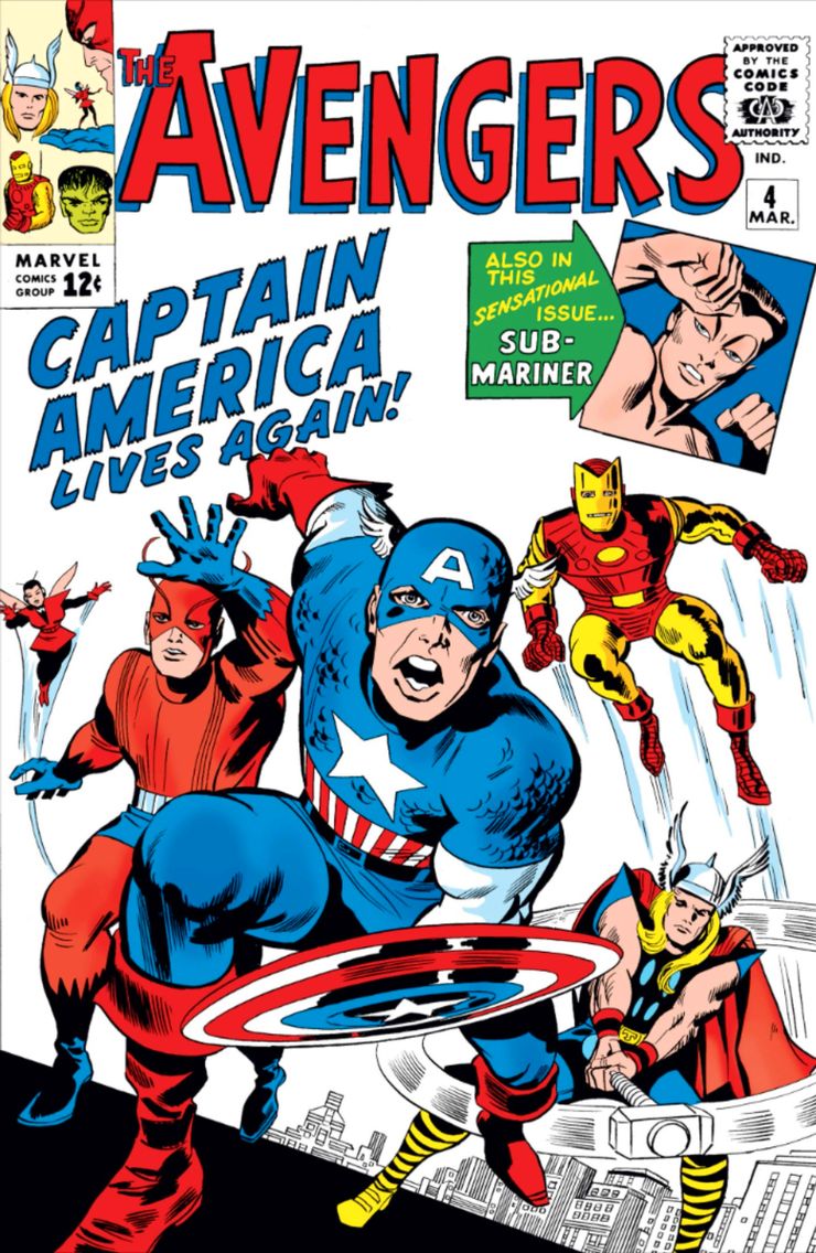 El Capitán América había sido un personaje popular durante los años 40 durante la Segunda Guerra Mundial. Su primer regreso oficial a los cómics fue, naturalmente, en un Vengadores comic, durante el cuarto número. La portada presenta a Cap al frente y al centro con el resto del equipo detrás de él.