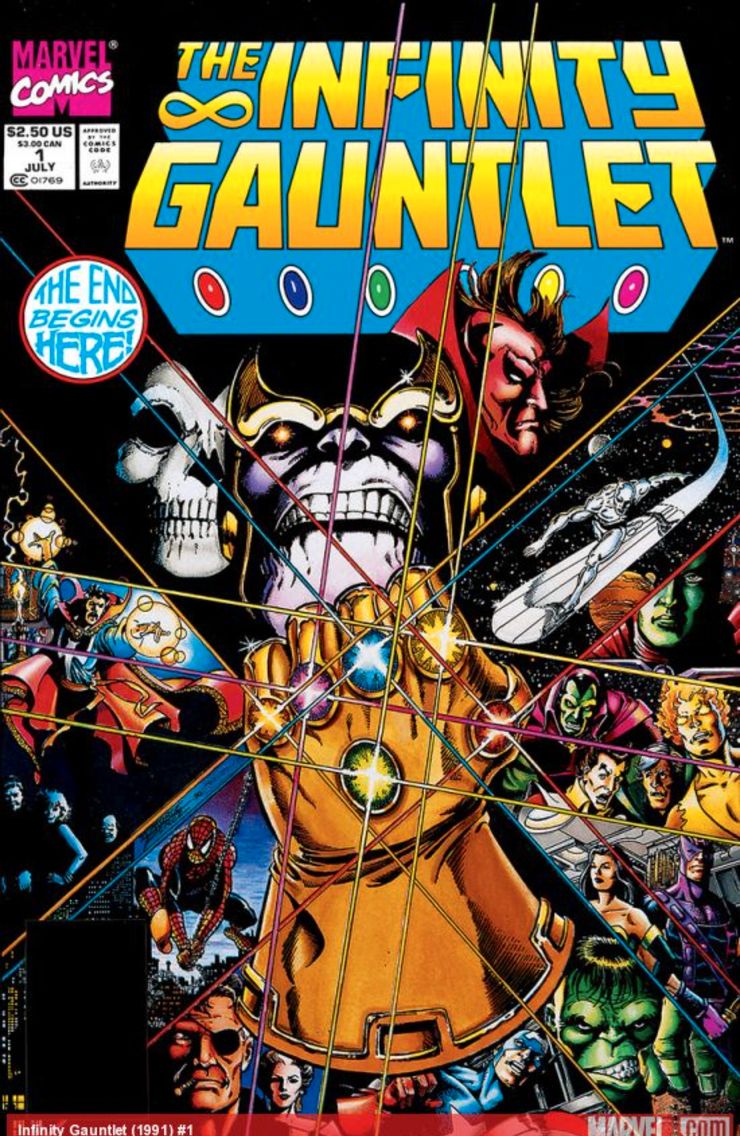 Si bien hay un evento cómico llamado Guerra infinita, la popular película de MCU del mismo nombre se basa principalmente en Guantelete del infinito que muestra a Thanos en su búsqueda para recuperar las Infinity Stones (llamadas Infinity Gems en los cómics). Si bien Thanos había existido antes de este cruce, fue entonces cuando el personaje se realizó por completo y la portada lo puso en exhibición completa.