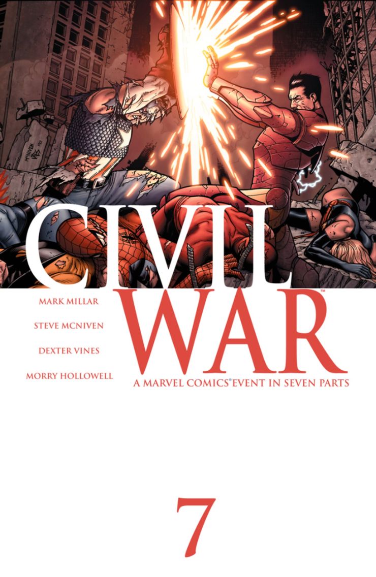 Esta imagen también llegó a la pantalla grande en la adaptación de la película, pero no tuvo el mismo impacto que el cómic. Tal vez fueron los rostros de Tony Stark y Steve Rogers haciendo muecas mientras se mantuvieron firmes, o tal vez los héroes ensangrentados y derrotados que los rodeaban. Han pasado varios años desde que salió el cómic, y la portada todavía da escalofríos cuando se la mira.