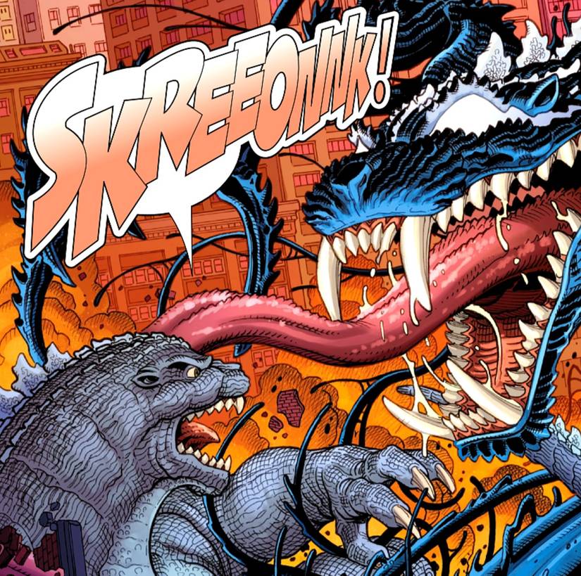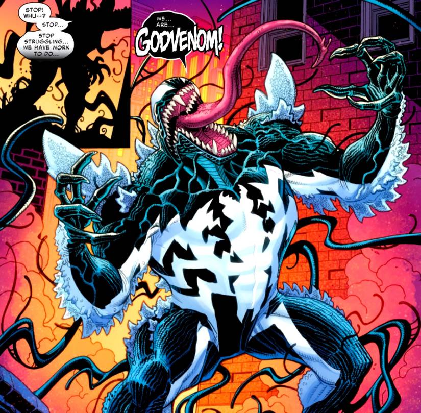 En el recientemente lanzado Godzilla vs Spider-Man – Por Joe Kelly, Nick Bradshaw, Rachelle Rosenberg y Joe Caramagna – Spidey se está balanceando a través de Nueva York cuando el rey de los monstruos ataca. El disfraz de Symbiote negro de Spider-Man termina uniéndose con Godzilla, creando un simbionte del tamaño de un kaiju que Spider-Man y Godzilla trabajan juntos para derrotar. Sin embargo, después de que el simbionte es derrotado, se escapa, unido con el anfitrión clásico Eddie Brock para convertirse en el aterrador Godvenom.