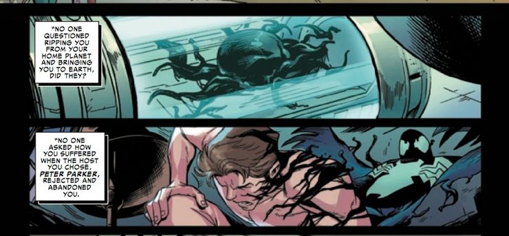 Por supuesto, Spider-Man se entera de que el traje es, de hecho, un extraterrestre vivo llamado simbionte y que está cambiando su comportamiento para peor. Infamemente, Spider-Man se deshace del traje en una iglesia e inevitablemente se une a Eddie Brock para formar el villano Venom. Sin embargo, Venom siempre se ha visto a sí mismo más como un protector letal, y de eso se trata esta nueva serie. Mientras habla con su simbionte, Eddie Brock recuerda cómo llegó a la Tierra. Se menciona muy brevemente, pero la forma en que está redactado hace que parezca que el traje tuvo un viaje completamente diferente al mencionado anteriormente. Él dice que el traje fue llevado de su planeta de origen a la Tierra. No hay ninguna mención de Battleworld en absoluto. También menciona cómo eligió a Peter Parker, lo cual es extraño dado que el traje salió de una máquina.