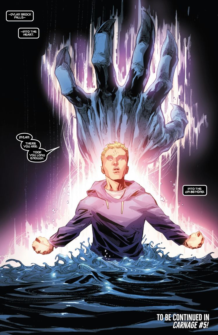 Dylan se ha encontrado con Carnage antes, pero esta es la primera vez que intenta luchar Carnage, y lamentablemente no sale bien. Mientras Carnage empala fácilmente a Dylan, parece que la historia de Dylan ha terminado, hasta que llega al Un-Beyond, con la versión más poderosa de Eddie Brock esperándolo.