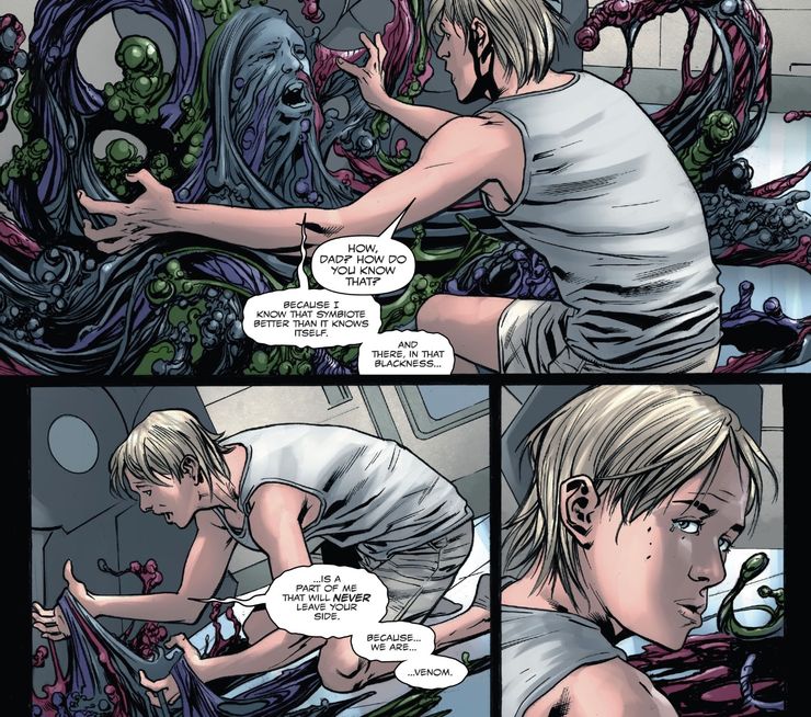 El simbionte Venom organiza un intento de rescate en el nuevo Veneno #4 de Ram V y Bryan Hitch. Sin embargo, Dylan necesita estar convencido de vincularse verdaderamente y participar en una simbiosis genuina con el simbionte de su padre. Para lograr esto, se necesita que el propio Eddie use cuatro simbiontes fusionados, creando su imagen en un charco de masa combinado. Eddie alienta a Dylan a vincularse con el simbionte, ya que una parte de él siempre estará ahí para Dylan al asumir el manto de Venom. Este momento entre el padre rey y el hijo heredero no es diferente a Mufasa hablando con Simba para recordar su destino (aunque con el uso de una sustancia pegajosa de simbionte en lugar de nubes majestuosas en las estrellas).