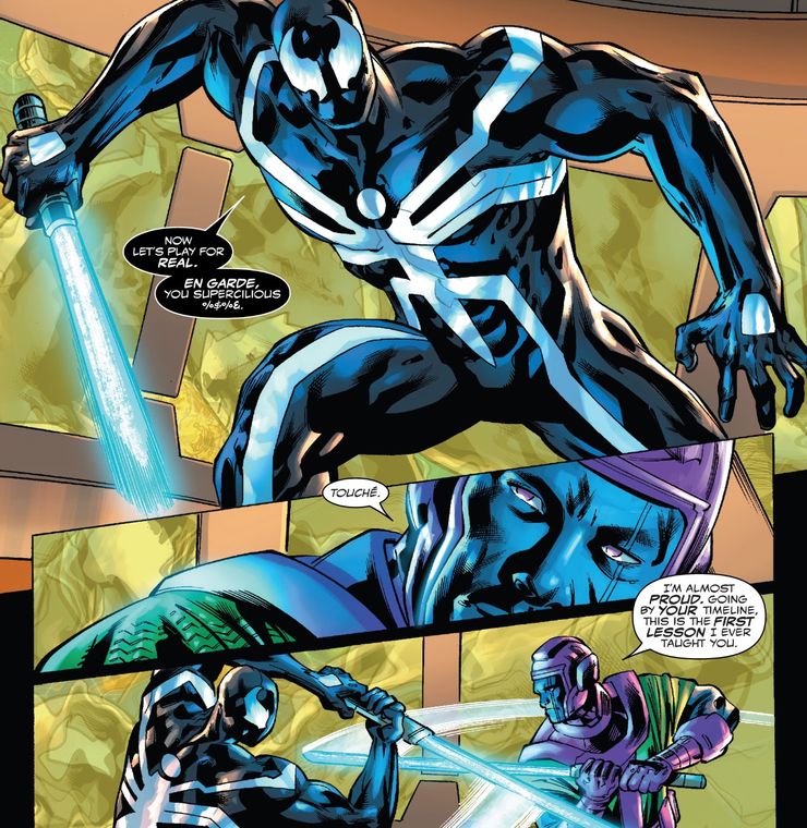 En el último número de Venom de Marvel Comics, Eddie Brock se encuentra en el futuro enfrentando sables de luz con nada menos que Kang el Conquistador.