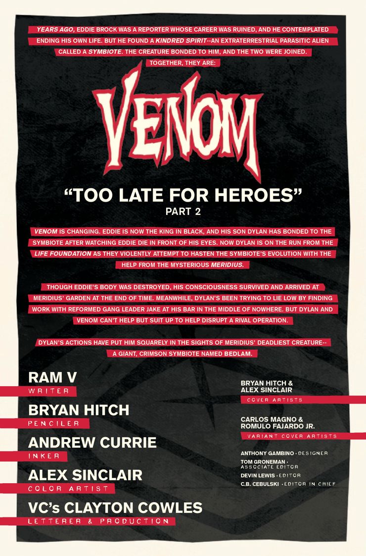 Como se vio en números anteriores de Veneno de Al Ewing, Ram V y Bryan Hitch, Eddie Brock se ha liberado de su cuerpo físico y del tiempo mismo, su conciencia vive a través del tiempo y el espacio a través de la mente de colmena del simbionte. Eventualmente, Eddie se encuentra en un oasis construido por un futuro Rey de Negro que se hace llamar Meridius. Ofreciendo una mano de amistad a Eddie y presentándole a otros Reyes de Negro de eras futuras, Meridius secretamente quiere que Eddie y su hijo mueran, habiendo orquestado eventos en el presente de Dylan que han visto a él y al simbionte de su padre evolucionar y volverse aún más oscuro que antes.