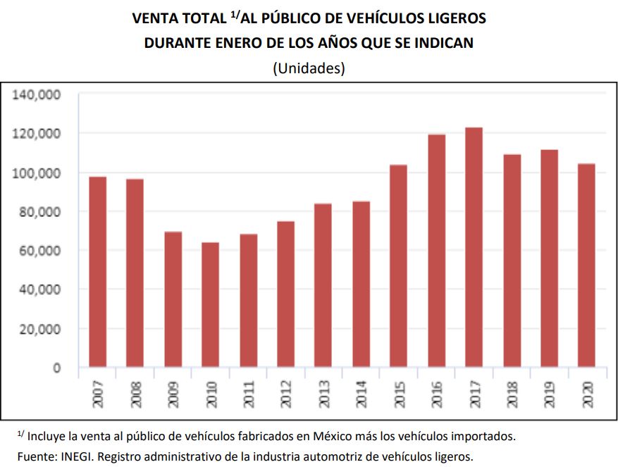 La industria automotriz inició este 2020 con cifras negativas en México, toda vez que la venta de vehículos ligeros disminuyó 6.0 por ciento durante el primer mes, reportó el Instituto Nacional de Estadística y Geografía (Inegi).