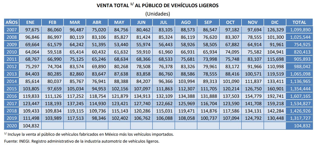Las cifras provienen de los registros administrativos de la industria automotriz de vehículos ligeros, que son recopilados de 21 empresas afiliadas a la Asociación Mexicana de la Industria Automotriz (AMIA), Mitsubishi Motors y Giant Motors Latinoamérica, precisó el Instituto.