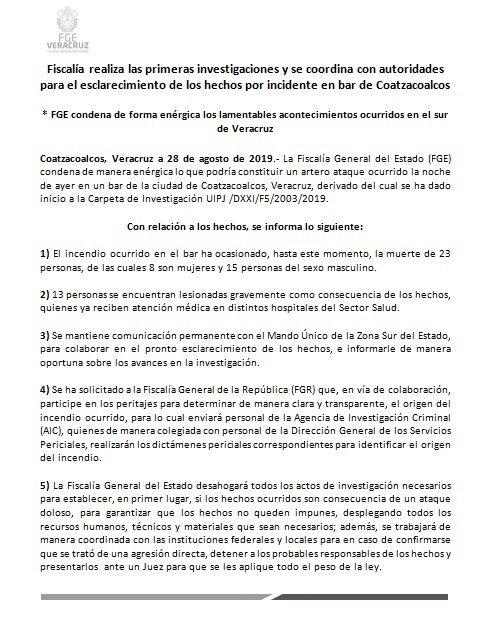 La Fiscalía General del Estado de Veracruz confirmó que hasta el momento hay 23 personas muertas, de las cuales 8 son mujeres y 15 hombres, y 13 heridos, como consecuencia de un incendio registrado anoche en el bar conocido como “El caballo Blanco”, de Coatzacoalcos, Veracruz.