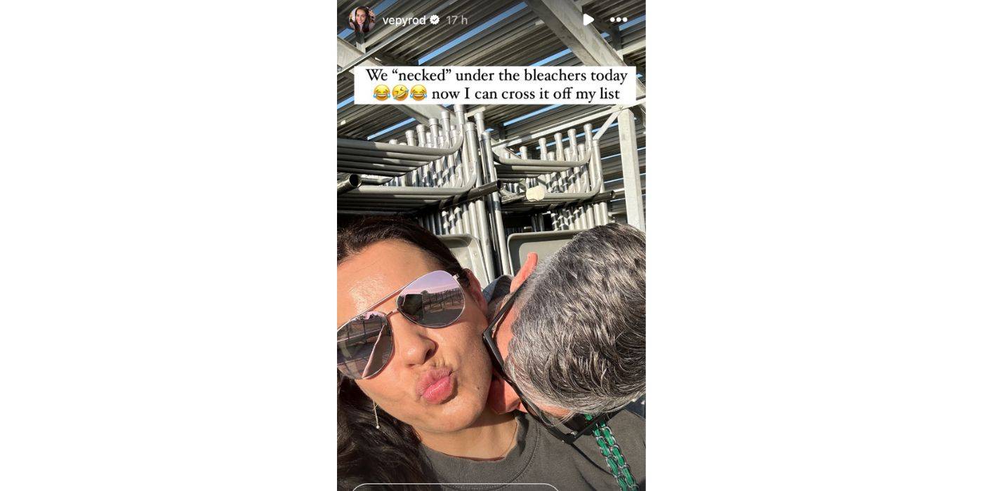 La selfie de Verónica la mostró con grandes gafas de sol mientras su novio intentaba ocultar su rostro besando su cuello. Verónica subtituló su historia de Instagram: “Hoy nos ‘besuqueamos’ debajo de las gradas,” y se rió, “Ahora puedo tacharlo de mi lista.”