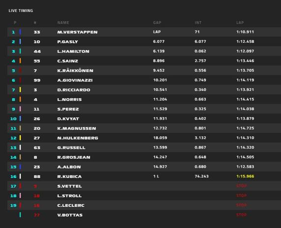 Y el desenlace no podía ser más apoteósico. A falta de dos giros, faltaba una última relanzada que iba a poner definitivamente patas arriba la carrera. A Albon, absolutamente desmelenado en la tercera posición, no le bastaba con su primer podio, intentó pasar a Hamilton y se pasó de optimista. El inglés cerró la puerta por el interior y se tocó con el tailandés. Trompo de Albon, que bajó del cielo al infierno, hasta la 15ª posición, en un santiamén. Eso dejaba a Carlos Sainz en la cuarta posición, por detrás de un Hamilton investigado por la acción con Alex y que, con el alerón dañado, iba a por un Gasly que sin saber cómo se encontró en la segunda plaza. Con Verstappen ya claro ganador, Lewis intentó salvar su honor yendo a por la segunda plaza. Se puso en paralelo a Pierre en la última curva, pero la superioridad de su coche no fue suficiente como para quitarle la segunda plaza a un Gasly que no podía creer lo que había pasado.