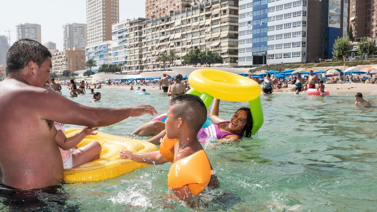 Cada mañana, la playa de Poniente de Benidorm es testigo de una carrera de veraneantes que compiten por plantar su sombrilla en primera línea. Este sábado, como muchas otras veces, los ganadores son los excursionistas del Bus Playero Viajero de Miluzka Arias. Partieron de Madrid a medianoche y han entrado en el municipio alicantino a las 6.30, todavía con noche cerrada. El flop, flop, flop de sus chancletas rompe el silencio de la Avenida Rei Jaume I, la que baja hasta el paseo marítimo. Cargan neveras, sombrillas, coches de bebé y pequeños altavoces para escuchar cumbia y vallenato. Apenas nadie ha podido pegar ojo. Muchos vienen de empalmada tras su jornada en la hostelería, la obra o al cuidado de niños y personas mayores. Pero da igual, el premio lo tienen ya delante. Una playa para ellos solos al amanecer.