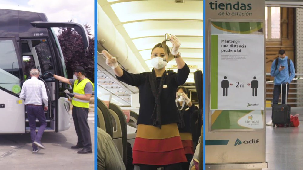 Las limitaciones a la movilidad de los ciudadanos acabaron este domingo con el fin del estado de alarma. Una circunstancia que coincide con el inicio del verano y el aumento de desplazamientos por las vacaciones. Tras reducir su capacidad hasta el 50% durante la crisis del coronavirus, el Gobierno ya permite el lleno total de los vehículos. Pero aun así, los medios de transporte colectivos han tenido que cambiar para adaptarse a las medidas de seguridad contra la covid-19. Este es un viaje en avión, barco, autobús y tren por la geografía española para conocer en primera persona la llamada nueva normalidad de los medios de transporte.AviónA partir de ahora se recomienda facturar el equipaje de mano, hay controles de temperatura en los aeropuertos y nuevos formularios para cumplimentar datos relacionados con la covid-19, entre las medidas para viajar en avión.BarcoLos pasajeros encontrarán numeración de las butacas, mamparas de separación y controles de temperatura en los trayectos en barco a Baleares o Canarias.AutobúsNuevos filtros para el aire, adiós al reparto de auriculares e implantación del billete electrónico, entre las medidas introducidas en los trayectos en autobús.TrenTiempos de espera distintos, cafeterías cerradas en los convoyes y procesos de desembarque adaptados son algunas de las diferencias con las que se encontrarán los usuarios del tren.Información sobre el coronavirus- Aquí puede seguir la última hora sobre la evolución de la pandemia- Así evoluciona la curva del coronavirus en España y en cada autonomía- Preguntas y respuestas sobre el coronavirus- Guía de actuación ante la enfermedad