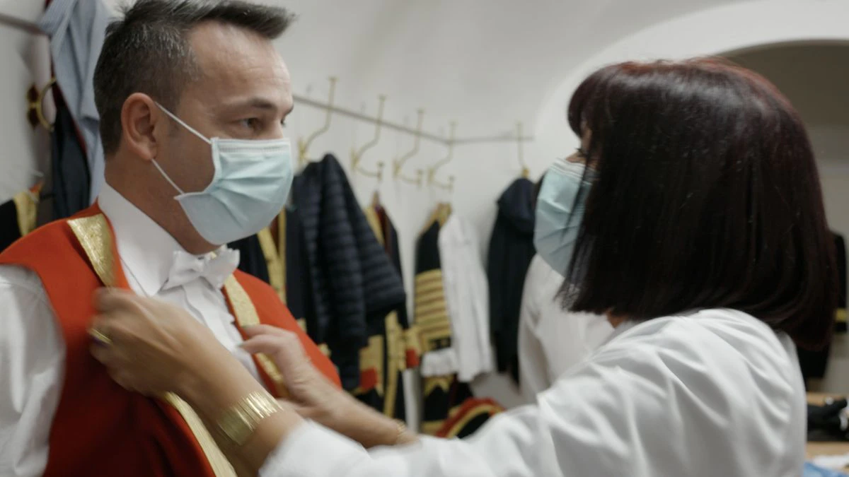 Un sonido de tacones rompe el silencio: “Echáis de menos a la mami, ¿verdad? No sé que van a hacer sin mí”, le dice al entrevistador. Beatriz García Martín, encargada de la sastrería histórica del Palacio, lleva desde 1990 creando los trajes del servicio de todo tipo de eventos de la Familia Real, como almuerzos, cenas de gala, cartas credenciales, la Pascua militar o el día de la Hispanidad. Ha estado al servicio de Juan Carlos I, al que tuvo que atender por un un lamparón en una ocasión, y de Felipe VI. Los días de acción, acompañada por su costurero, asiste en un pequeño cuarto a quien se ve apurado por una mancha o por la rebeldía de un hilo suelto que descuelgue una medalla. Ha asistido a presidentes como Pedro Sánchez a ministras, como Ana Pastor, y a mandatarios de otros países, como la argentina Cristina Kirchner.