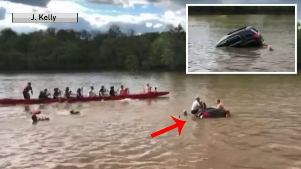 La dramática escena quedó captada en un video en el que se aprecia a los dos hombres que intentaron irrumpir en el vehículo mientras continuaba hundiéndose. Un tercer hombre con un neumático de hierro saltó al río para ayudar.