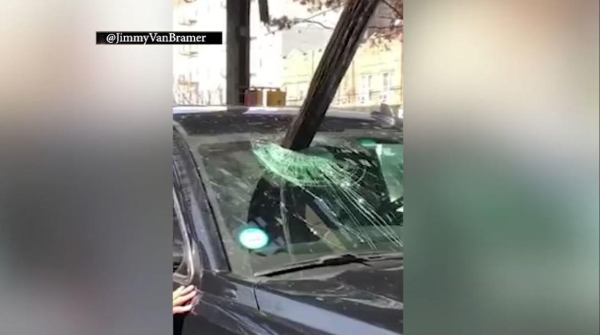 Viga de madera cae como rayo y atraviesa auto en marcha