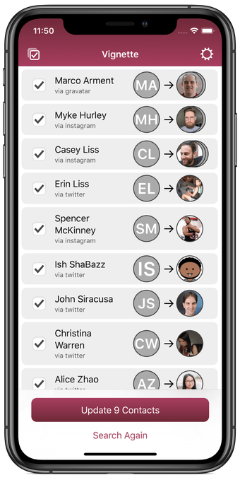 Vignette es fácil de usar. La aplicación escaneará campos de selección en tus contactos, incluido el correo electrónico (que se usa para Gravatar), Twitter, Facebook y el campo de red social personalizada, Instagram. (Instagram no es una de las opciones integradas en los contactos de iOS, desafortunadamente).