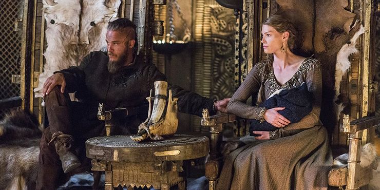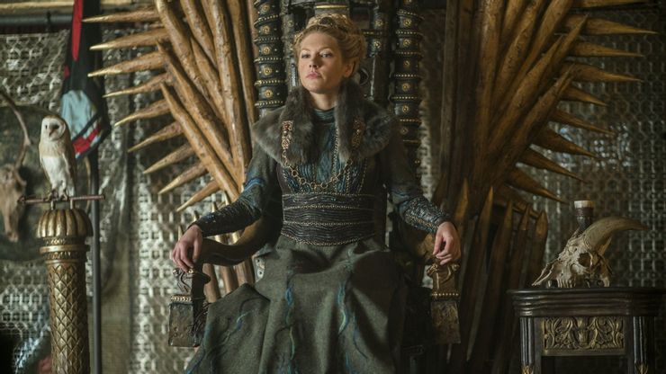 Sus estandartes azules están colgados en el Salón, haciendo juego con los escudos de sus guerreros, y reemplaza los dos tronos del pasado por uno significativamente más dramático para ella. Este trono incluye estacas de madera erizadas desde la parte posterior, significativamente más intimidantes y que recuerdan a las alas de Valkyrie. Una vez más, el simbolismo es claro. Lagertha no tiene ningún interés en gobernar con un esposo o tener los dos tronos del pasado. También hay, sin duda, un nivel de despecho al quitar el trono en el que se sentó Aslaug, junto a Ragnar.