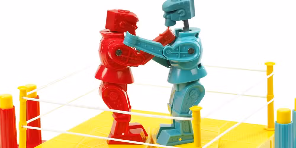 Publicado inicialmente por Louis Marx and Company en 1964, Rock ‘Em Sock ‘Em Robots es un clásico juego de mesa para dos jugadores diseñado por Marvin Glass and Associates. El juego presenta un robot rojo y uno azul (conocido como Red Rocker y Blue Bomber) donde el objetivo es que cada jugador golpee al robot del otro hasta que le arranquen la cabeza. En la década de 2000, Mattel rediseñó el juego.