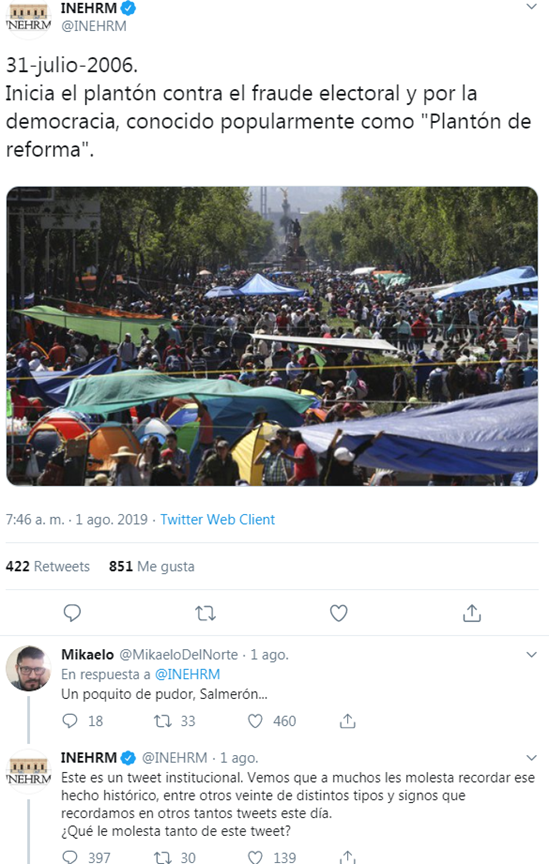 Salmerón piensa que la causa de su separación del cargo —lo sugiere así en su carta de renuncia— fue una “campaña mediática” de los enemigos del gobierno, que lo usaron como pretexto para golpear a López Obrador. Me temo que se equivoca. Hace un par de meses, cuando el INEHRM recordó con una nota muy semejante a la del martes 17 el inicio del plantón contra el fraude electoral de 2006 en el paseo de la Reforma, se produjo un “escándalo” muy parecido al que acaba de costarle la chamba. Los enemigos del gobierno pusieron el grito en el cielo. Se dijo que el texto del INEHRM promovía la polarización del país. Se dijo también que las elecciones de hace trece años habían sido justas y limpias. El PAN llegó a decir que la nota constituía un caso de “malversación de fondos públicos” y que semejante falta tenía “alcances punitivos al código penal federal” —al menos de acuerdo con esta nota. Pero no pasó nada. Se gritó en Twitter; se tranquilizaron los ánimos. Salmerón siguió haciendo su trabajo.