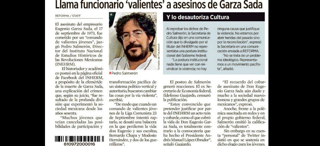 El diario Reforma cree que llamar “valientes” a los guerrilleros que asesinaron a Eugenio Garza Sada equivale a justificar su comportamiento y, peor, que implica exaltar la violencia como forma de lucha política. La cabeza y el primer párrafo de la nota aparecida el viernes 20 —que puede verse aquí— lo afirman sin lugar a dudas; tanto como el editorial publicado el día anterior —que puede verse aquí—, donde el periódico se preguntó si Andrés Manuel López Obrador y Alejandra Frausto compartían la “santificación” de los asesinos implícita según esto en el uso del adjetivo.
