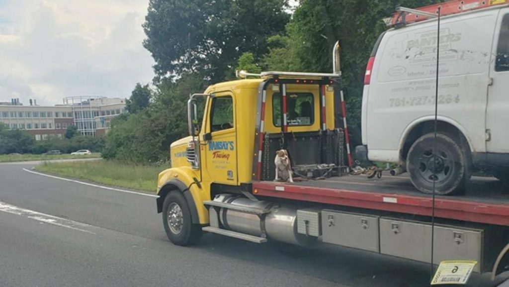 Una imagen de un perro sentado en la plataforma de un camión de remolque conduciendo en una carretera estatal de Massachusetts ha causado revuelo provocando el despido del conductor.