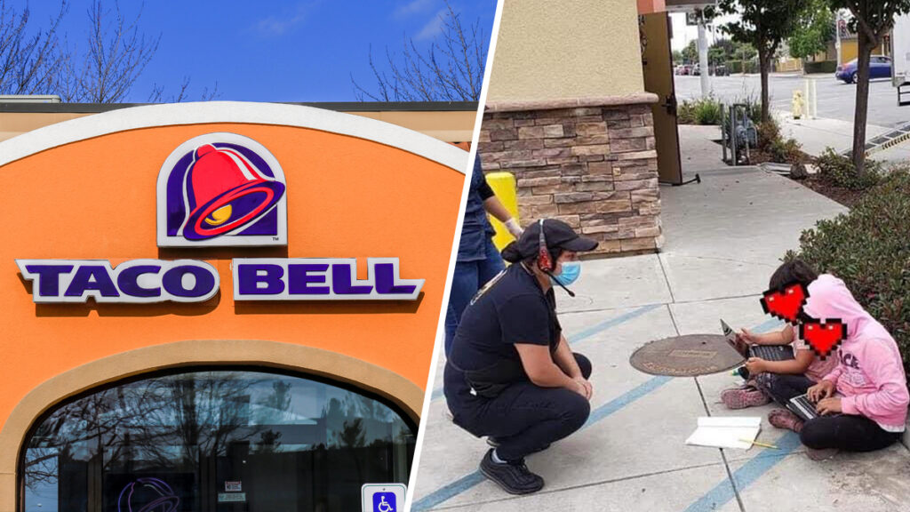 En la fotografía, se muestra a las dos niñas sentadas en la acera con computadores en el regazo y un cuaderno y un lápiz al alcance de la mano, mientras dos empleadas de Taco Bell, con mascarillas, las observan a una corta distancia.