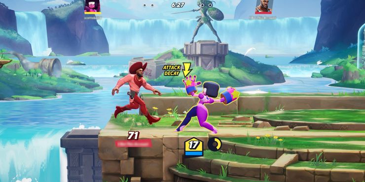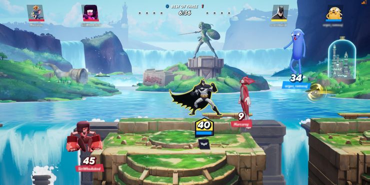 En términos de jugabilidad, MultiVersus tiene los mismos conceptos centrales que el Super Smash Bros. serie. El objetivo es derribar al jugador enemigo hasta el borde de la pantalla, causando que pierda una vida. Cuanto más daño reciba el enemigo, más será repelido. Los combos de entrada de juegos como luchador callejero v se reemplazan con pulsaciones de un solo botón y entradas direccionales. Una forma clave en la que MultiVersus difiere de Super Smash Bros. es la falta de elementos, salvo los que los personajes pueden invocar por sí mismos, como Shaggy con sus sándwiches arrojadizos o los artilugios de Harley Quinn. La capacidad de otorgar ventajas e infligir desventajas es una parte importante del juego y todos los personajes pueden sufrir “Attack Decay” si el jugador repite un movimiento durante demasiado tiempo, lo que hace que sea una mala idea repetir movimientos.