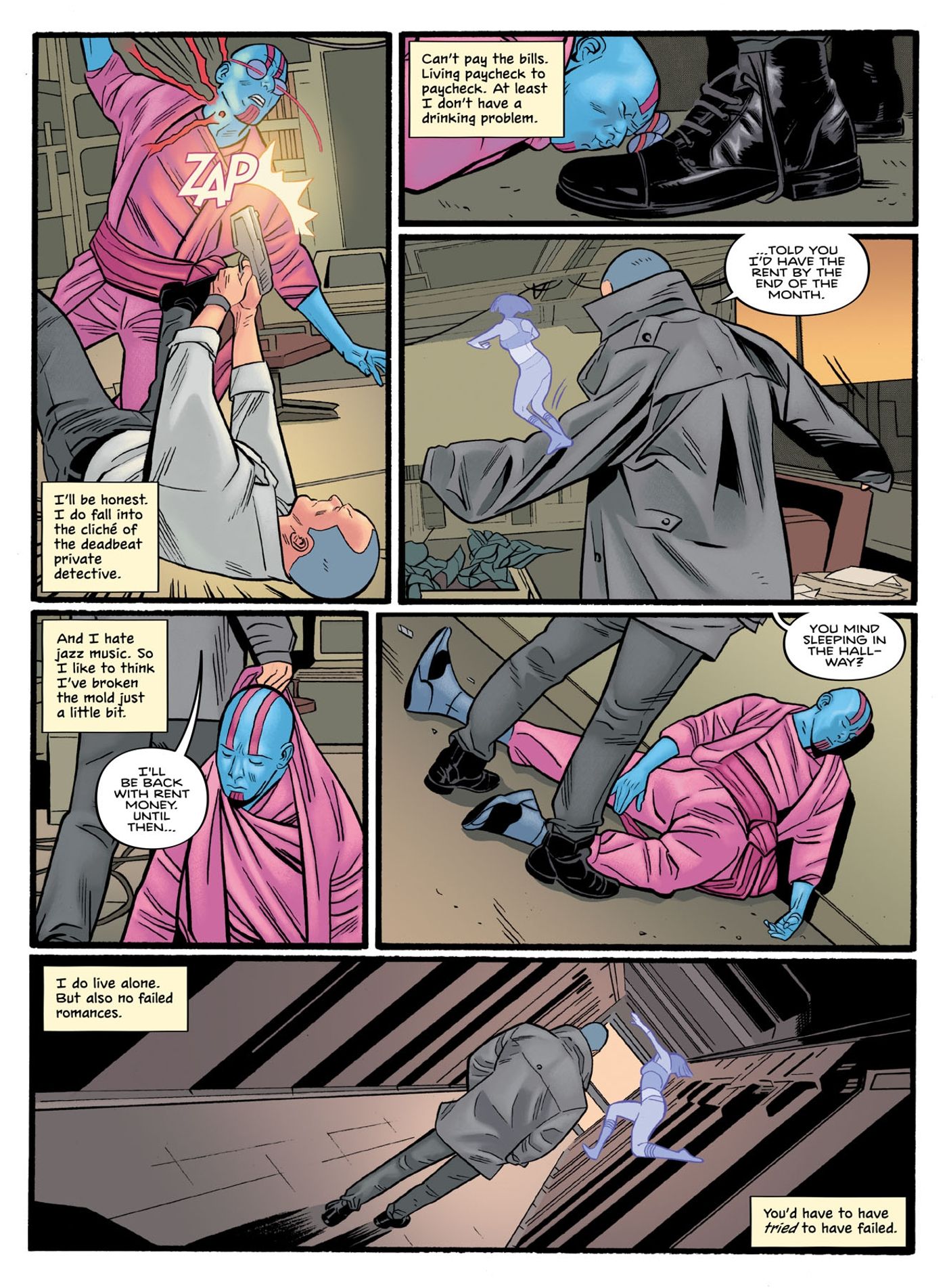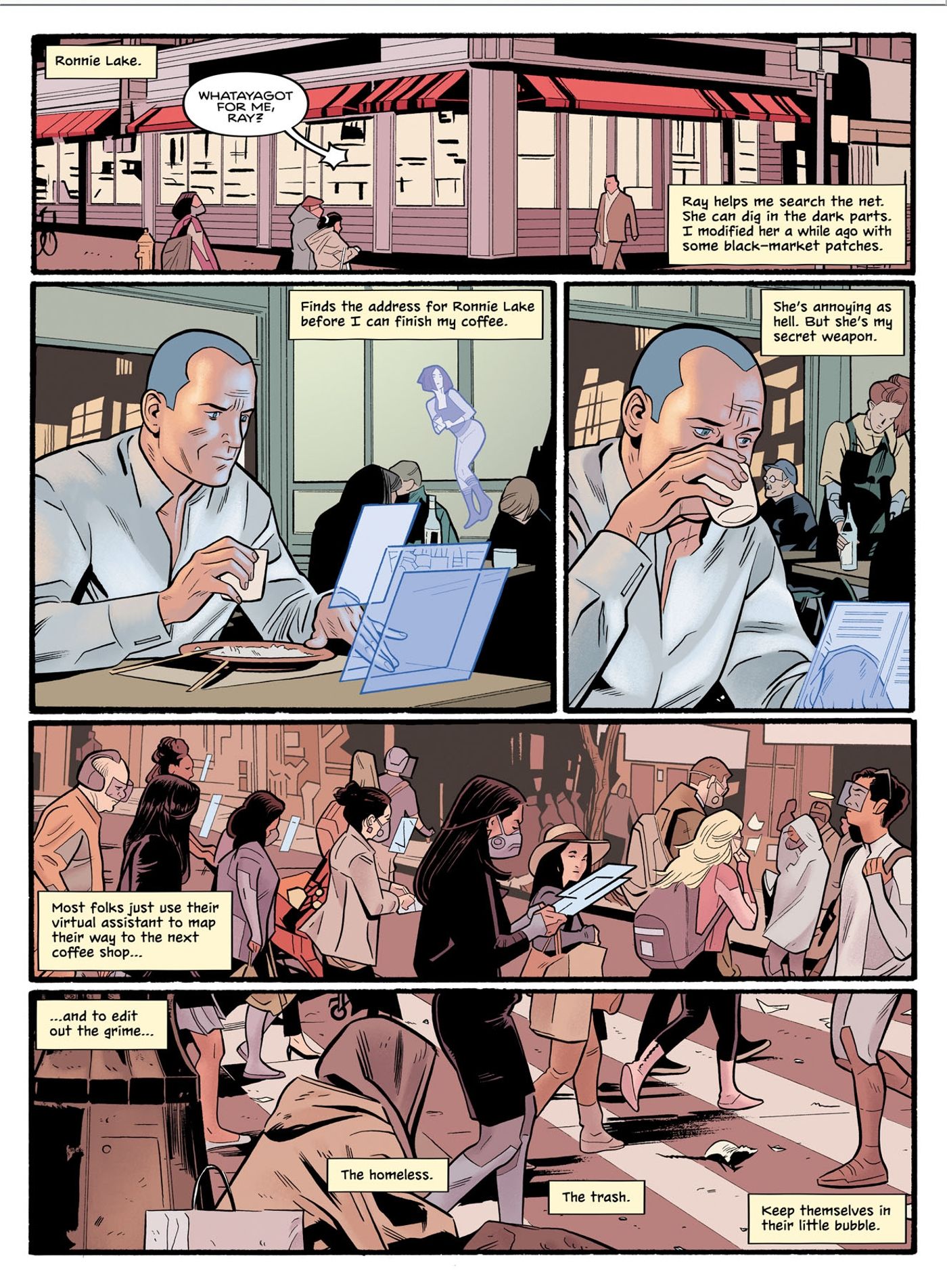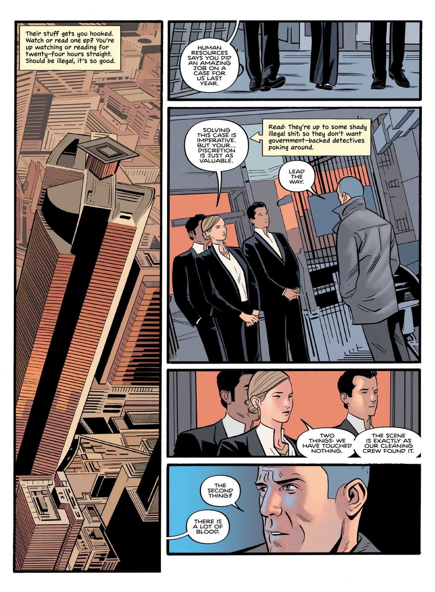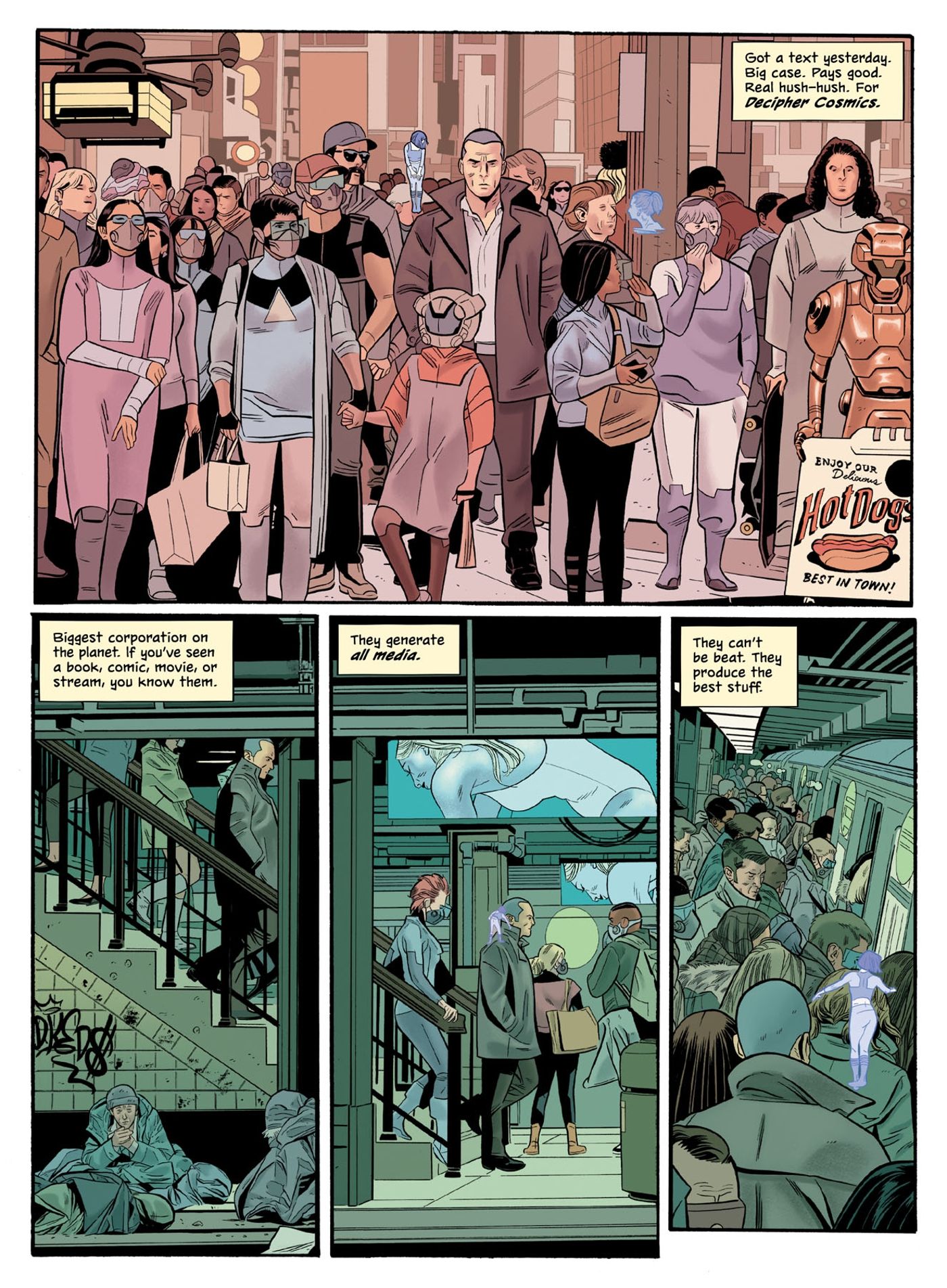 En un adelanto de Subgénero #1 Por Kindt y Torres, el detective Verge narra sus problemas como investigador privado. Somete a su arrendador y le promete que tendrá todo el dinero que necesita para pagar el alquiler cuando regrese. Verge asume un nuevo caso para Decipher Cosmics, la empresa de medios más grande del mundo. Desafortunadamente, tienen una escena del crimen incompleta llena de sangre y solo están contratando a Verge para resolver el caso y evitar que la noticia salga a la luz. Verge investiga un poco a un hombre rico llamado Ronnie Lake y, con la ayuda del asistente de inteligencia artificial de Verge, encuentra a Lake y se dirige a interrogarlo.