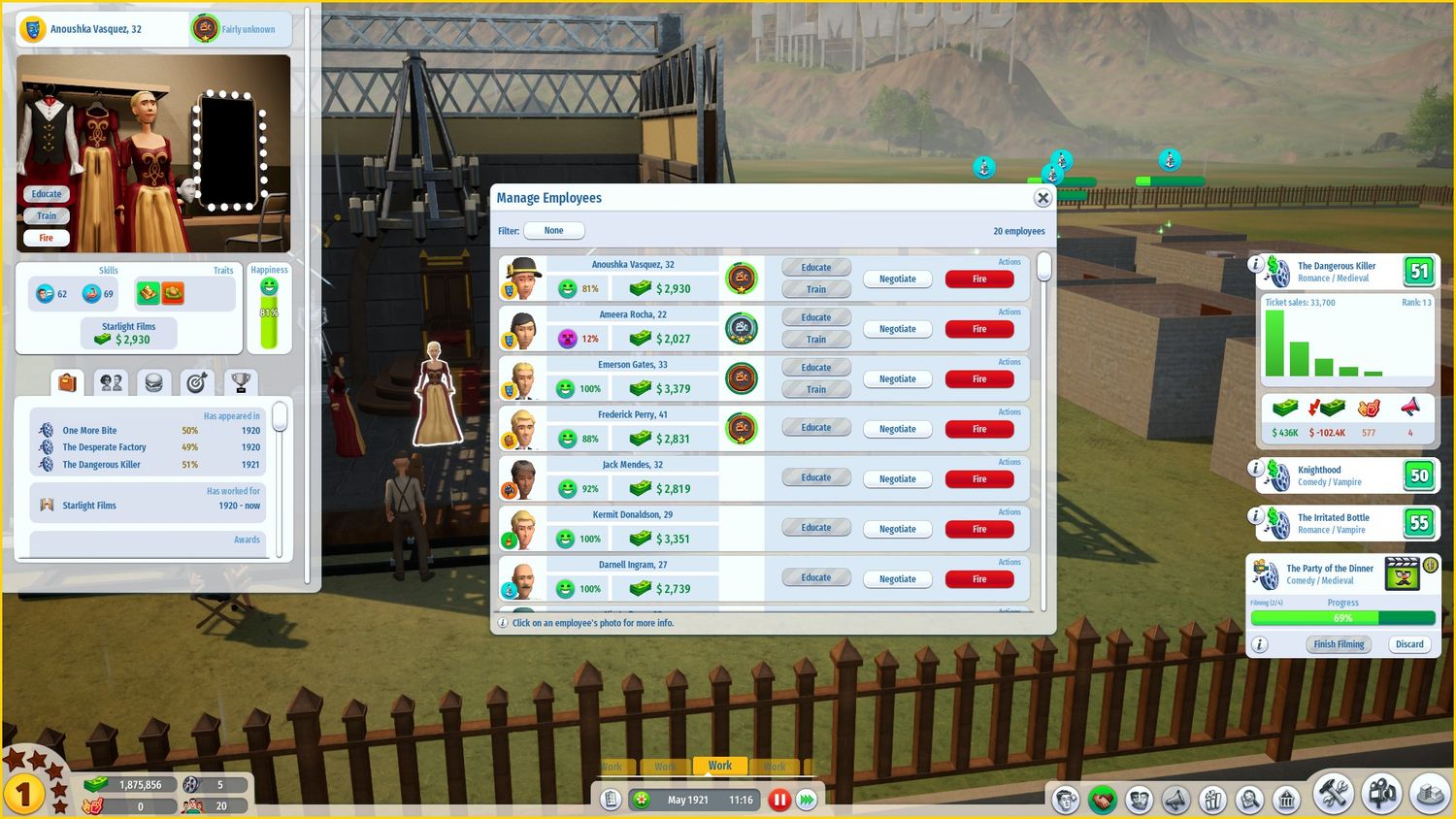 Por supuesto, podría decirse que las personas más importantes del lote son los actores, quienes desempeñan un papel dominante en el éxito general de una producción. Su carisma y habilidades atléticas se corresponden con sus habilidades de actuación y acrobacias, y pueden incrementarse mediante el entrenamiento. A medida que actúan en más películas, su nivel de fama crecerá, lo cual es un arma de doble filo: un actor más famoso generará más entusiasmo por futuros estrenos, pero también tendrán expectativas cada vez más altas sobre cómo trata el estudio. ellos, incluida la provisión de alojamiento en barrios cada vez más caros.