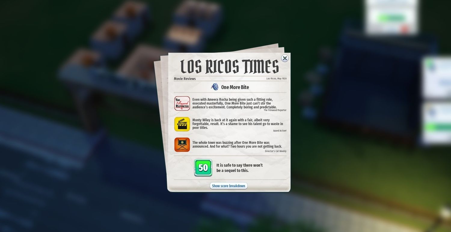 Una gran cantidad de factores contribuyen al éxito general de una película, como las actuaciones, la tecnología utilizada para filmarla y la idoneidad temática de sus decorados y los controles deslizantes de contenido antes mencionados. Después de que se publique cada uno, los jugadores podrán ver las reseñas de los críticos, que pueden ser hilarantemente devastadoras, así como desgloses detallados de lo que afectó su puntuación. Cada diciembre se lleva a cabo una ceremonia de premios, y los lanzamientos que funcionan lo suficientemente bien pueden recibir nominaciones y premios que darán una gran ayuda a las producciones del estudio el año siguiente.