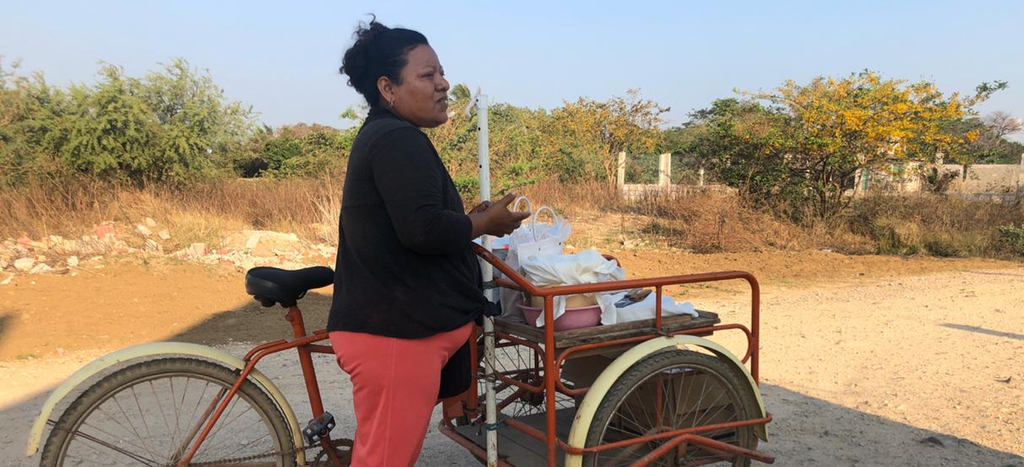 Juchitán, Oax.- Aída elabora antojitos istmeños, desde tamales hasta el atole con elote. Todos los días recorre las calles de Juchitán; entra a un colonia y así va con su triciclo recorriendo otras hasta que su productos terminen.