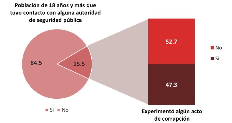 Durante el primer semestre de 2019 se estima que el 15.5 por ciento de la población adulta tuvo contacto con alguna autoridad de seguridad pública, de los cuales 47.3 por ciento declaró haber sufrido un acto de corrupción por parte de éstos.