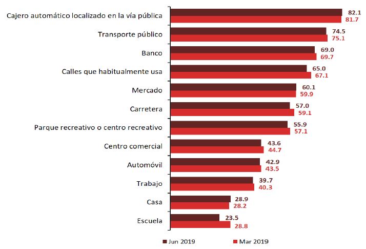 Los sitios en donde más insegura se siente la población mexicana son: cajeros automáticos localizados en la vía pública (82.1%), en el transporte público (74.5%), en el banco (69%) y en las calles que habitualmente usa (65%).