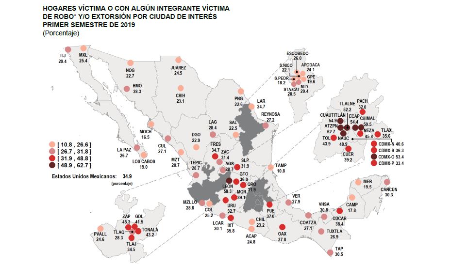 Durante el primer semestre de 2019 se estima que 34.9 por ciento de los hogares en zonas urbanas tuvieron integrantes que fueron víctima de al menos un delito de robo total o parcial de vehículo, robo en casa habitación, robo o asalto en calle o transporte público (incluye robo en banco o cajero automático), robo en forma distinta a las anteriores, o extorsión.