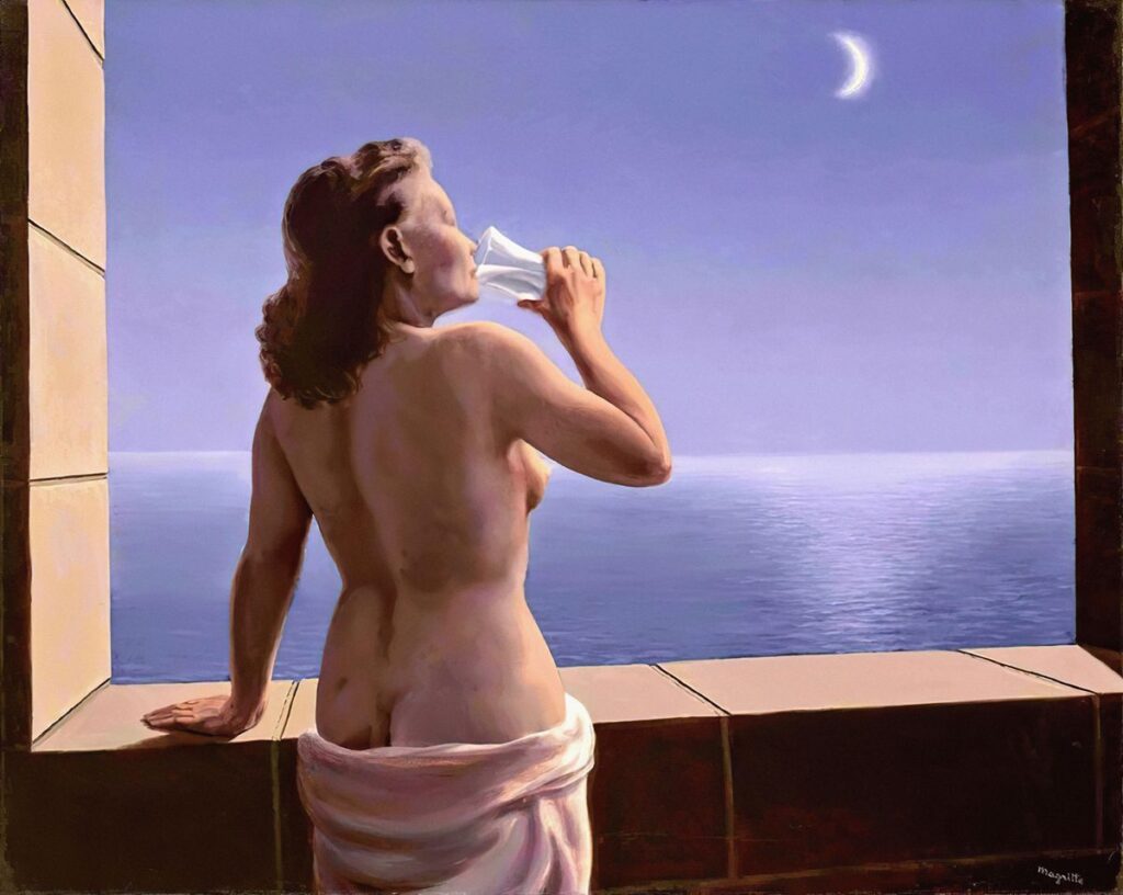 Pero donde las palabras y las imágenes chocan como partículas que desatan reacciones en cadena es en el encuentro entre el cuadro y su título, entre las figuras y las escenas con frecuencia impenetrables y los títulos asignados a ellas, que en lugar de explicar su misterio lo hacen más hermético, lo proyectan en direcciones inesperadas. Guillermo Solana, comisario entusiasta y sospecho que también omnisciente de la exposición de Magritte en el Thyssen, se inclina mucho sobre un cuadro y casi toca con el dedo índice un detalle revelador, como un detective que busca huellas en la escena de un crimen. Debajo de cada enigma que suscita uno de estos cuadros, explica Solana, hay otro enigma, y a veces otro más, y casi todos están conectados con los títulos. Magritte tenía horror de las explicaciones, sobre todo las psicológicas y psicoanalíticas que estuvieron tan de moda todo el siglo pasado. La pintura expresa el misterio del mundo, y las explicaciones lo banalizan y lo empobrecen. Frente a la prisa por interpretar cuanto antes, el título invita a una pausa respetuosa de contemplación, sugiere posibilidades que no necesitan formularse con palabras. Una mujer madura, opulenta, casi desnuda, en escorzo, bebe un vaso de agua delante de una ventana que da a un mar en calma, iluminado por un gajo de luna nueva que irradia una claridad como de plenilunio. En el cuerpo de la mujer hay una solidez escultórica. El cuadro, pintado en 1947, se titula Las profundidades del placer.