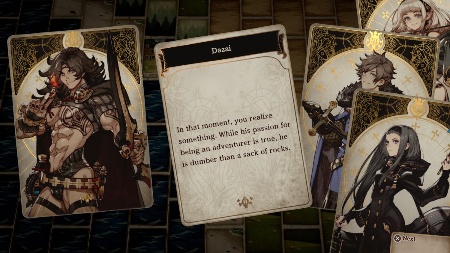 Si hay un problema con Voz de cartas, es que a menudo se siente improductivamente agotador en su combate. Las batallas frecuentes son un elemento básico especialmente al explorar áreas de mazmorras, y si bien pueden ser desafiantes en algunos puntos, a menudo es una simple cuestión de tomar uno o dos turnos para atravesar las líneas enemigas sin mucha dificultad. Los personajes, la historia y la construcción del mundo del juego son sus elementos más interesantes, y el combate a veces parece que se interpone en el camino de las partes más atractivas que se ofrecen. La simplicidad mecánica también significará que los jugadores de mesa experimentados encontrarán pocas cosas demasiado desafiantes, al menos al principio, que es también donde la narrativa es más débil; esto significa que Voz de cartas requiere un compromiso para superar la construcción inicial del mundo y el desarrollo de combate para realmente disfrutar de lo que se ofrece más adelante.