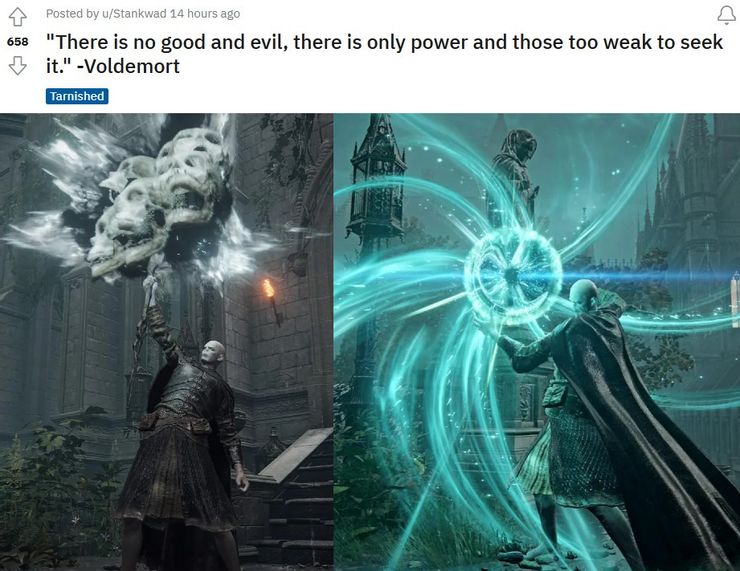 harry potter los fanáticos estarán felices de saber que este mismo nivel de cuidado y atención se ha prestado a un Anillo de Elden versión del notorio mago oscuro Voldemort. Una publicación del usuario de Reddit Stankwad contiene varias imágenes de este avatar en el juego, que muestra cómo usa hechicerías poderosas como el cometa Azur para emular el inmenso poder de Lord Voldemort en el mundo de harry potter. Este jugador también utiliza hechicerías de muerte como Rancorcall, lo que le da al avatar una sensación genuina de maldad y oscuridad. Por supuesto, la apariencia de serpiente de Voldemort (inspirada más en su apariencia cinematográfica que en la descripción de su libro) también se ha recreado fielmente.