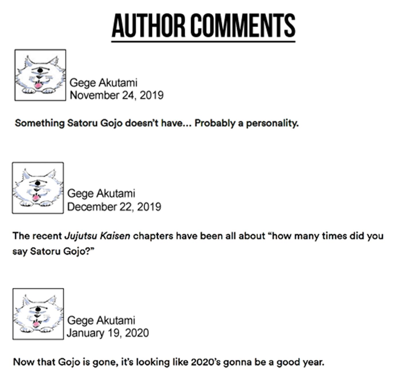 Gege Akutami ha expresado su desdén por Gojo en los comentarios de su autor recopilados por Shonen Jump. Este hecho es bastante divertido, debido al estatus de Gojo como Jujutsu Kaisen personaje más querido.