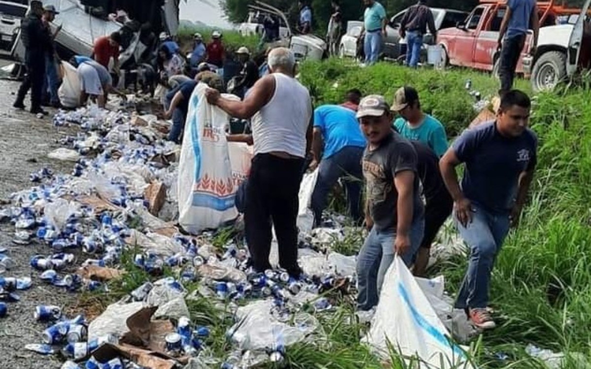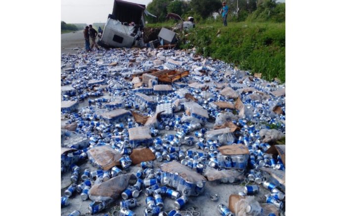 Un camión cargado con cervezas volcó la tarde de este jueves en la Carretera Nacional, a la altura del municipio de Linares, Nuevo León… lo que siguió fue un acto de rapiña por vecinos de la zona y viajeros que transitaban por la vía de comunicación que decidieron aprovechar el momento.