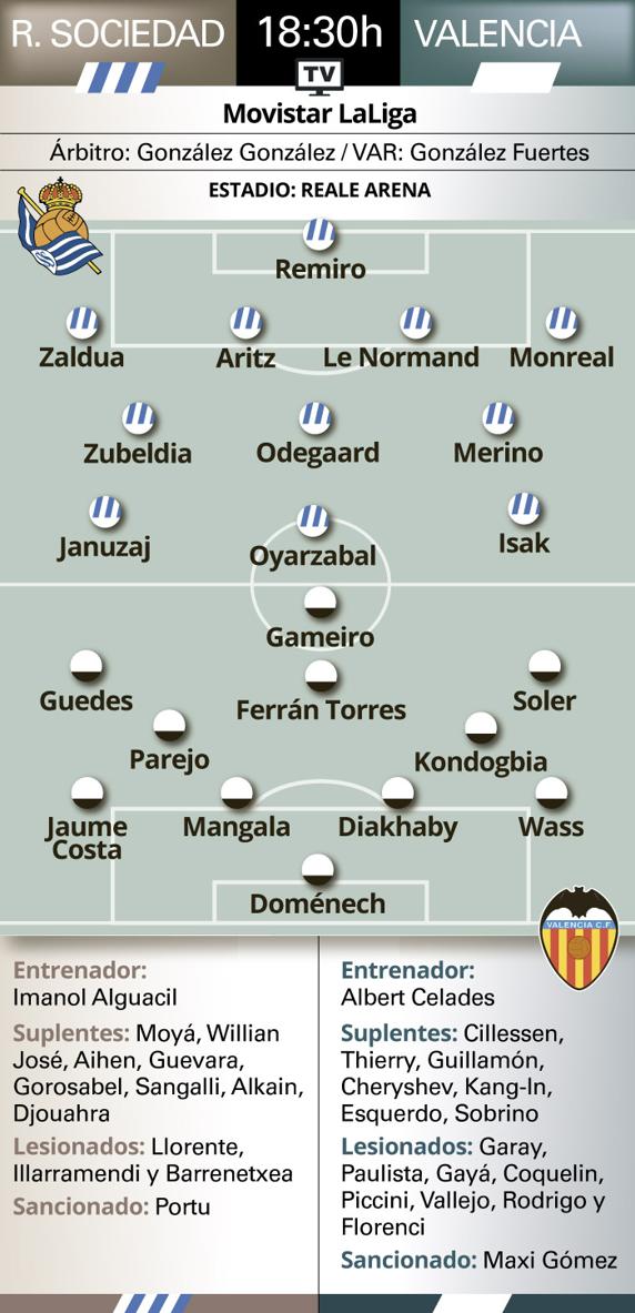 La Real entrará en Europa a través de un vuelo directo siempre que derrote al Valencia en Anoeta. Con el duelo contra el Eibar pendiente, los de Imanol parten en la octava plaza de la clasificación, un escalón por debajo del visitante que se presenta hoy en Donostia. Un punto separa a los contendientes, que encarnan esta tarde uno de esos enfrentamientos clásicos de Primera División.