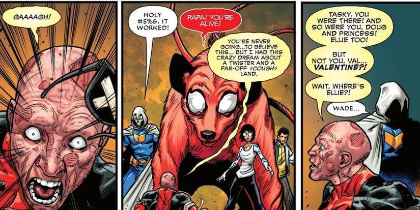 ¿Cómo baja? El número concluye que Ellie encuentra un medio para resucitar a Wade con la ayuda de la expareja de Deadpool, Valentine Vuong. La pareja puede usar los poderes de Valentine para resucitar a Wade. Así que sí, nuestro mercenario bocón ha vuelto.