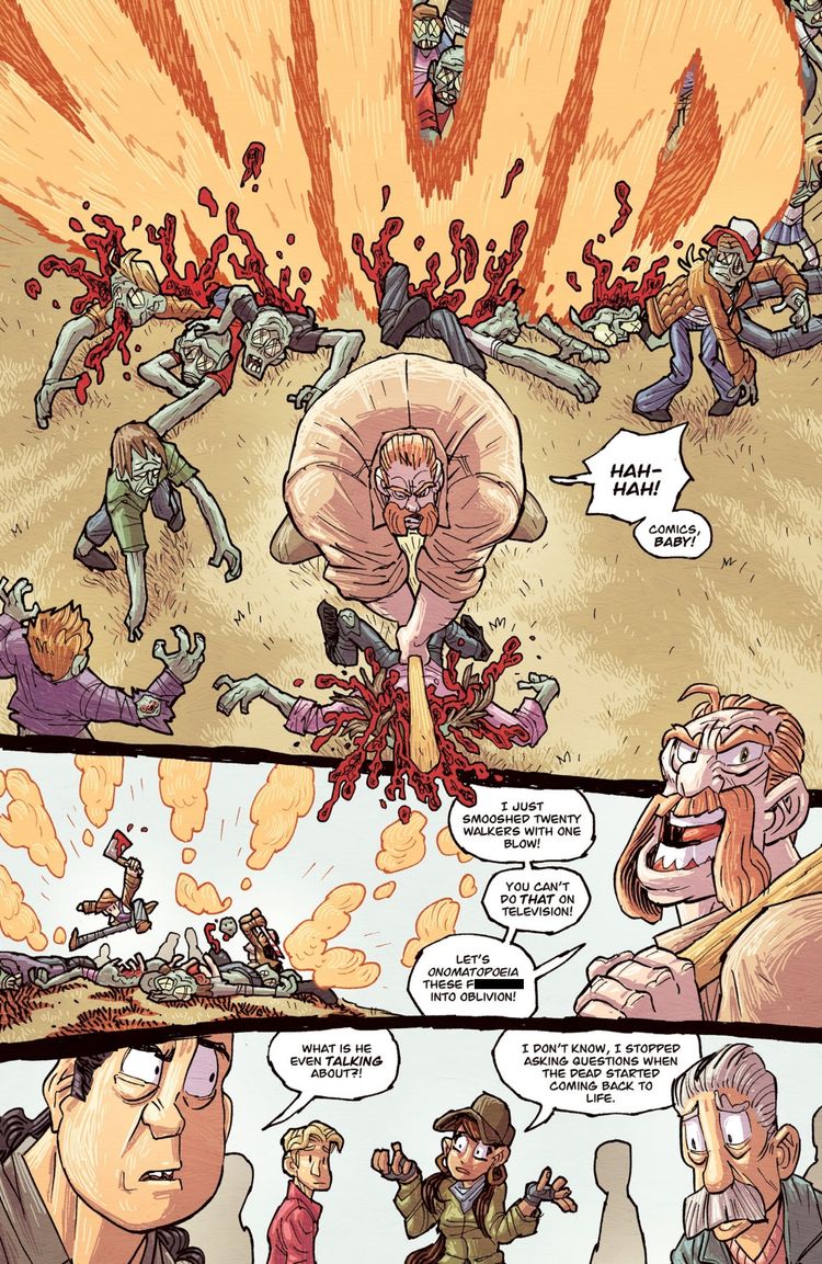 Los muertos vivientes de lujo‘s Bocados pequeños El cómic es más o menos lo que los lectores obtuvieron del número principal, ya que ambos representan a los supervivientes matando hordas de zombis. Sin embargo, la versión de los eventos de Small Bites tiene personajes icónicos que usan onomatopeyas para matar a los zombies. Cada representación visual de un sonido emitido por las armas se utiliza como arma en sí. Cada “rebanada” y “wam” reverbera a través de la horda de zombis, y Abraham incluso elimina a veinte Caminantes de un solo golpe.