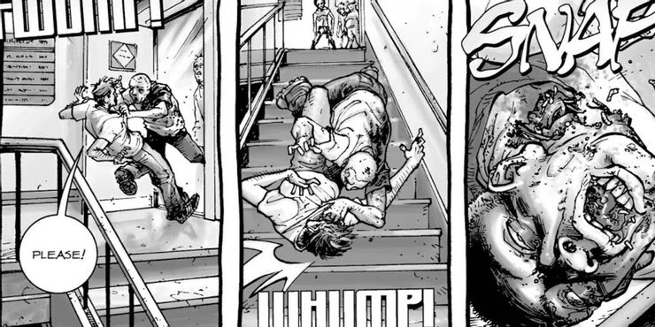 En Los muertos vivientes # 1 de Image Comics, Rick Grimes se despierta de un coma y, antes de que pueda reaccionar a su entorno, descubre que se ha producido un brote de zombis en todo el hospital. Termina tropezando con el suelo después de encontrarse con un gran grupo de enfermeras, pacientes y personal del hospital como monstruos no muertos, mientras uno logra agarrar su camisa. Empujándolo al suelo nuevamente, el zombi y Grimes caen por las escaleras, y el caminante tiene una gran oportunidad de morder a Rick, pero en cambio, caen juntos cuando la cabeza del zombi se cae perfectamente después de golpear el suelo. Por pura suerte, Rick evita una muerte segura.
