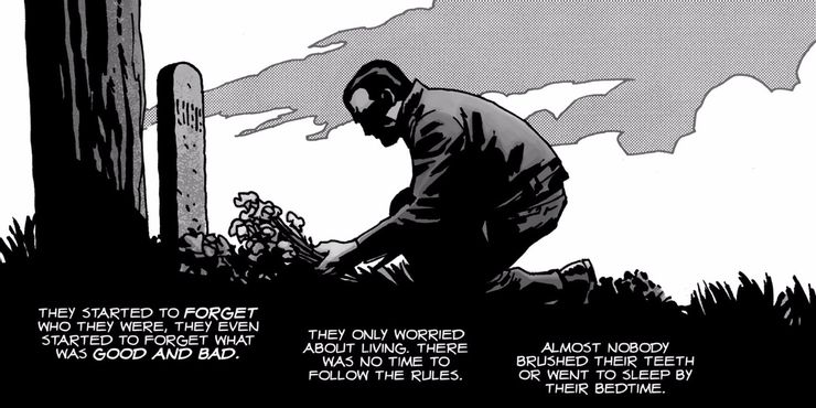El futuro de Negan yace en el aislamiento ya que vive lejos de la sociedad. Hace una breve aparición en este número final poniendo flores en la tumba de su difunta esposa después de negarse a ver a Carl anteriormente en el número, presumiblemente debido a la vergüenza persistente que siente por sus crímenes pasados. Sin embargo, si bien su debut fue terriblemente violento, Negan logró redimirse a sí mismo a lo largo de la serie, aunque parece que puede tener una última prueba de expiación, una que se relaciona con su primer asesinato en el panel. Hershel es un hombre que creció sin un padre, y debido a esa ausencia mezclada con la sobreprotección de su madre, se convirtió en una persona consentida y privilegiada que está enojada con el mundo. Hershel merece la oportunidad de enfrentarse al hombre que le robó a su padre, y Negan debe enfrentarse a las consecuencias de su peor crimen.